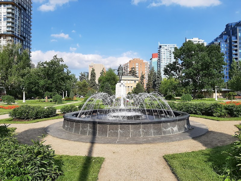 Relaxed city park featuring landscaped gardens, war-memorial statues, a fountain & a library.