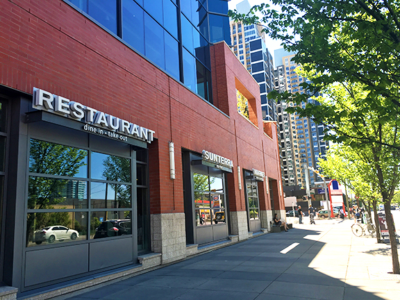 A chalkboard menu & bright interiors with an array of build-your-own sandwich & burger options.